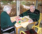 Bewohner bei der Beschäftigungs-therapie mit Blick in den Garten.